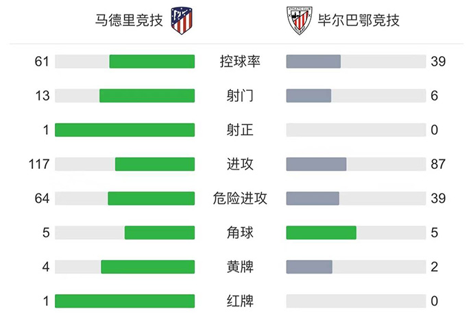 全场比赛结束,最终马竞0-0战平毕尔巴鄂。