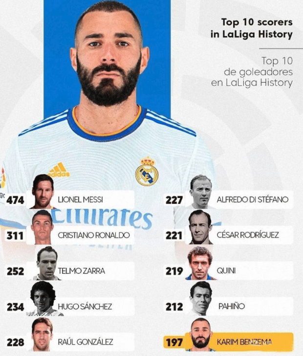 C罗和梅西均率领球队爆冷丢分。阵容配置没有以往豪华的西甲豪门皇马继续高歌猛进,1-0击败了国际米兰,皇马的老将和新星全都展现了出色的竞技状态,维尼修斯、卡马文加、罗德里戈3大天才新星接力爆发,33岁的本泽马成为最抢眼的老将,他老当益壮扛着皇马前行。根据西甲最新的官宣消息,职业生涯代表皇马已经夺取20冠的射手本泽马进入西甲历史射手榜的前十,他在上一轮西甲完成帽子戏法之后打进了共计197粒西甲进球,正式杀入西甲历史射手榜前10,排到了第10名。