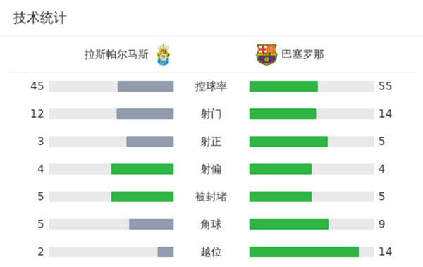 最终全场比赛结束,巴萨2-1拉斯帕尔马斯。