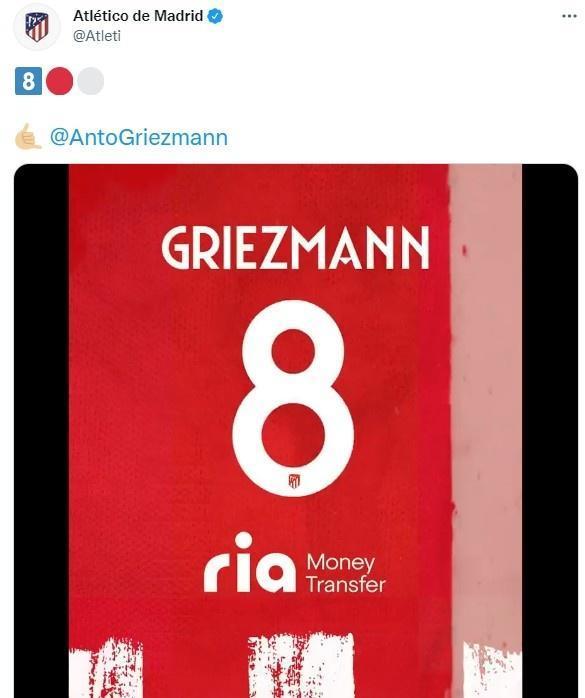 马竞官方:格列兹曼新赛季穿8号球衣