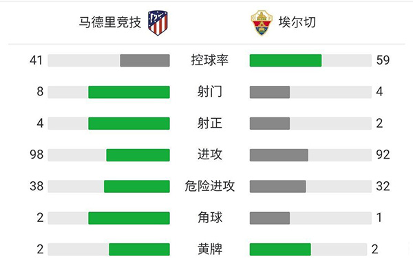 最终全场比赛结束,马竞1-0小胜埃尔切,迎开局两连胜。