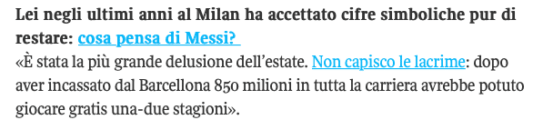 科斯塔库塔对于梅西的离队表达了自己的质疑和失望之情,这位AC米兰传奇表示:“不是我不理解大家的眼泪,而是我认为,梅西在此前的职业生涯中,已经在巴萨挣了8.5亿欧元,这些钱足够他一辈子衣食无忧了,所以我认为,如果梅西真的热爱巴萨,他本可以选择免费为巴萨效力1-2个赛季。”