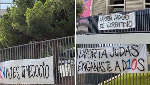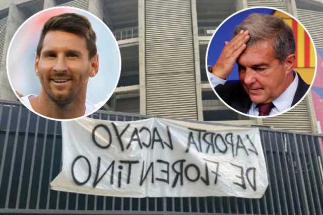 巴萨球迷在这些横幅上写道:“拉波尔塔是叛徒!”;“你是弗洛伦蒂诺的走狗!巴萨已经与你无关!你只是个生意人!”:“梅西去巴黎了,你却到伊比萨岛度假去了!”:“犹大!你欺骗了梅西!”