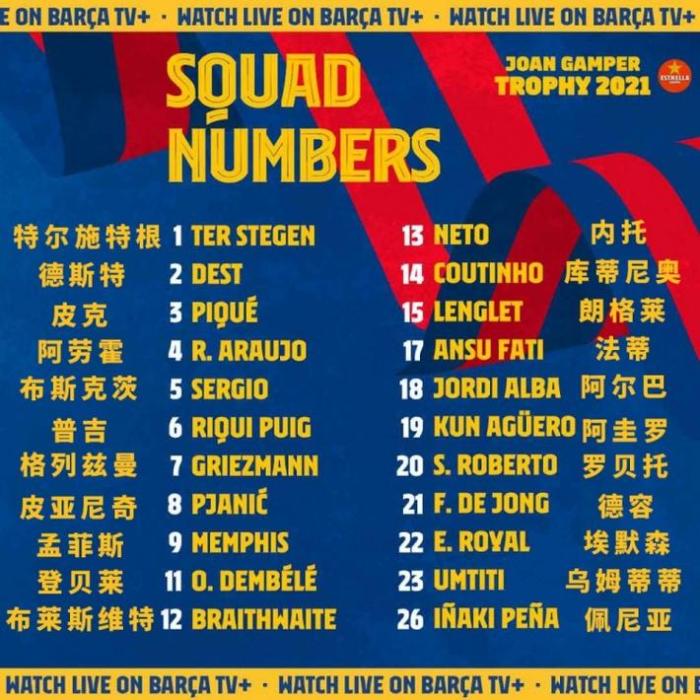 JRS直播网讯 巴萨甘伯杯球员名单
