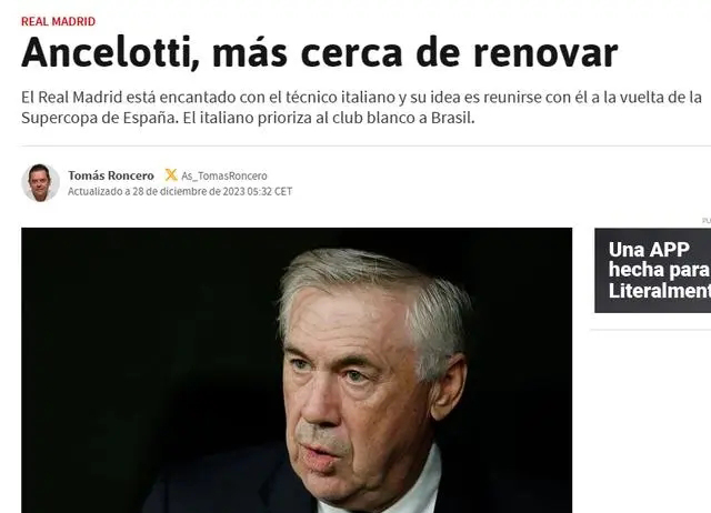 JRS直播网12月29日讯 据西班牙《阿斯报》报道,皇马本赛季上半程的强势表现给俱乐部决策层留下了深刻印象,俱乐部将在未来几周内与安切洛蒂续约至 2025 年夏天。