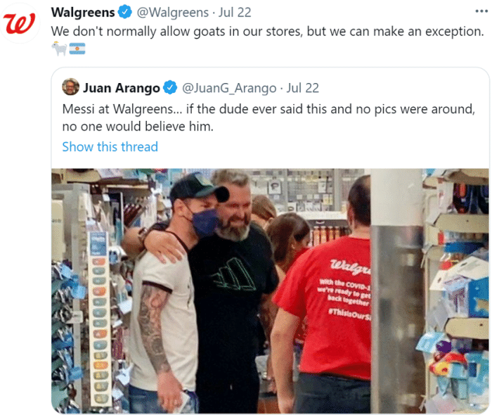 JRS直播网讯 梅西近日现身美国一家知名药房,并被球迷们发现,虽然这家药房的官推调侃称“山羊不许入内,但这次可以例外”。