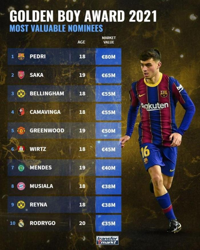 JRS直播网讯 消息,德国转会市场网公布了今年金童奖候选人的身价排行,巴塞罗那新星佩德里以8000万欧元居首。