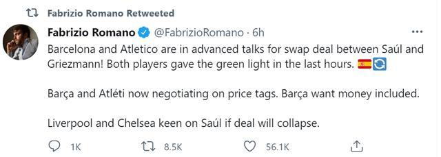 根据此前消息,巴萨和马竞有意让格列兹曼和萨乌尔互换东家,而罗马诺表示两支俱乐部的谈判已经进入进阶阶段,两名球员过去几小时也已经同意转会。
