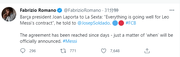 梅西和巴萨的上一份合同6月底正式到期,不过他几天前就已经和巴萨就续约达成一致,巴萨官宣只是时间问题。