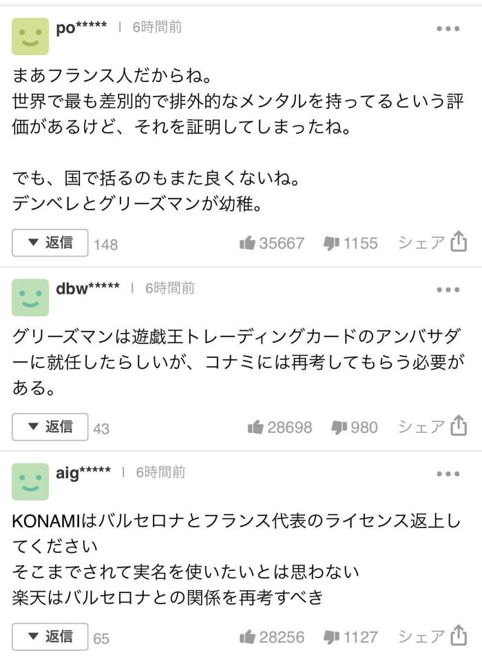 本身巴萨的几大知名赞助商当中就有日本公司存在,而且巴萨一直以来在日本的影响力是很大的。此时登贝莱却爆出这样的歧视性言论,这引起了日本网友的不满。不少日本球迷直言,应该让登贝莱赶紧滚出巴萨。还有日本网友认为,登贝莱本身就是黑人,随便一个亚洲人拉出去颜值都比他高。同时还有网友发布一些猴子和香蕉的表情予以还击,连带着格列兹曼也遭到了日本网友炮火的波及。