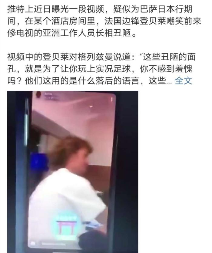 JRS直播网讯 北京时间7月4日讯:近日,法国球星登贝莱和格列兹曼又被推上了舆论的风口浪尖。有人在推特上翻出了一段貌似巴萨日本行的视频,视频当中几名亚裔工作人员正在维修酒店房间内的电视机。而登贝莱一直在旁边喋喋不休,他对着格列兹曼说道:这些丑陋的面孔就是为了让你玩上实况足球,你不该感到羞愧吗?他们用的什么语言?我们是在一个发达国家还是一个不发达国家?