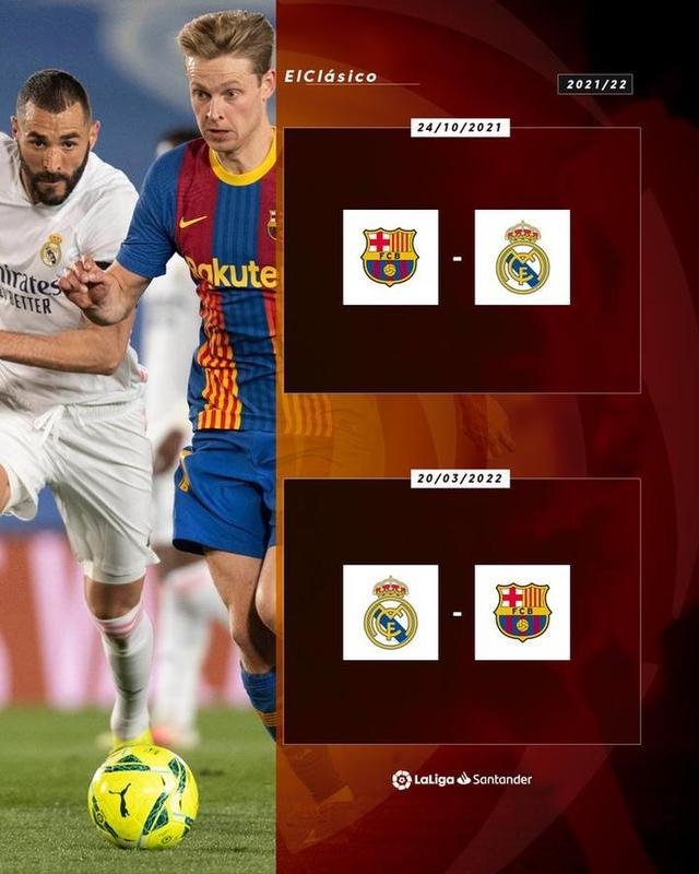 JRS直播网讯 据西甲联赛官方消息,2021-22赛季西班牙国家德比将于2021年10月24日和2022年3月20日进行。