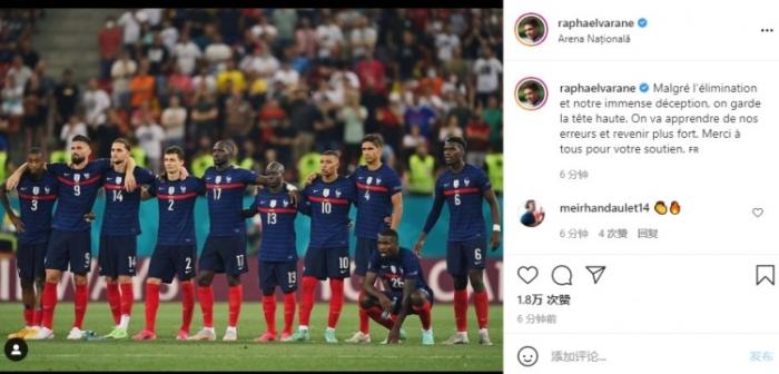 今天凌晨结束的另外一场比赛中,法国队点球7-8爆冷被瑞士队淘汰,止步十六强,赛后法国队中卫瓦拉内在社交媒体上发布一张与队友们的合影,并配文:“尽管被淘汰出局了,尽管我们对结局感到非常失望,但是我们依然是高昂着头颅离开欧洲杯的。我们将从我们的失误中吸取教训,并变得更加强大。谢谢大家的支持!”