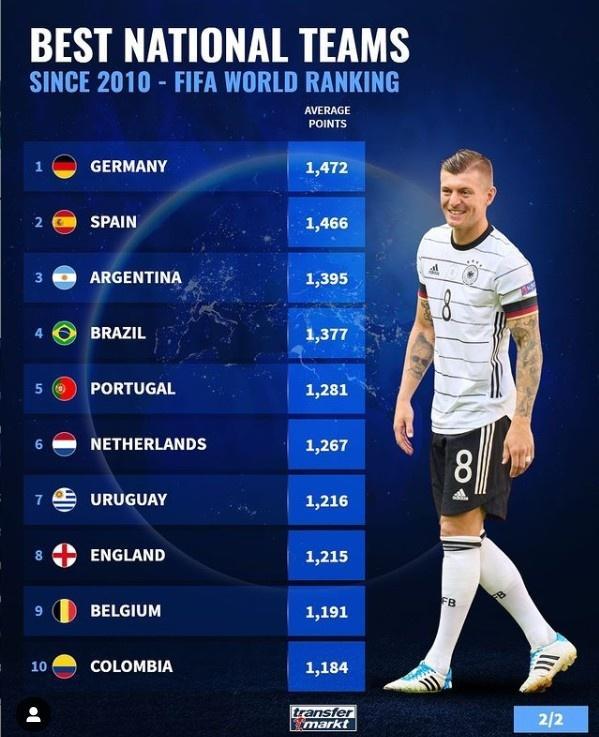 JRS直播网讯紧随其后的是1466分的西班牙,梅西的阿根廷积1395分排名第三,巴西积1377分排名第四。