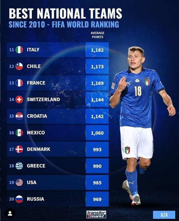 上届世界杯冠军法国没有进入前10,他们积1169分位居第13位。本届欧洲杯四战全胜的意大利积1182分排在第11位。