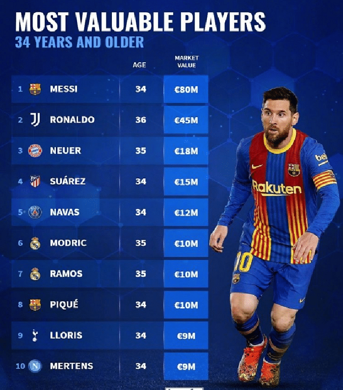 而梅西和C罗之后是拜仁队内35岁的门将诺伊尔,他的身价是1800万欧元,随后是34岁的苏亚雷斯,他的身价是1500万欧元,跟着是34岁的纳瓦斯,他的身价是1200万欧元,随后是35岁的马蒂奇,35岁的拉莫斯和34的皮克,他们的身价都是1000万欧元。而排名第九和第十的是34岁的洛里斯和34岁的默滕斯,他们的身价都是900万欧元。