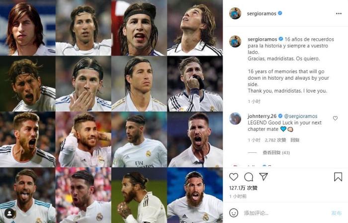 同时拉莫斯写道:“16年的记忆将会载入史册,我永远在你的身边。谢谢你,皇马,我爱你。”