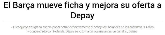 该媒体表示,为了防止被截胡事件再次发生,巴萨希望在3-4天内和德佩签约,他们修改了报价,为了让德佩下定加盟巴萨的决心。