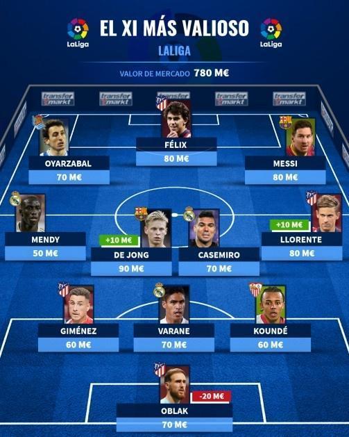 前锋:奥亚尔萨瓦尔(皇家社会,7000万欧),菲利克斯(马竞,8000万欧),梅西(巴塞罗那,8000万欧)