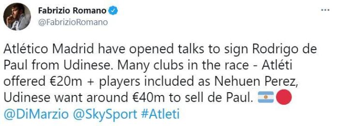 马竞与乌迪内斯就德保罗开启谈判,许多俱乐部都在竞争中,马竞为德保罗报价2000万欧元+00后阿根廷国青中卫内乌恩-佩雷斯,乌迪内斯想以4000万欧元左右的价格出售德保罗。