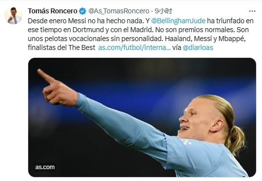 龙赛罗气愤写道:“自1月份以来的近1年时间,梅西就没做过任何事情。而贝林厄姆这段时间,无论是在多特蒙德还是转会皇马后,都不断取得胜利。“