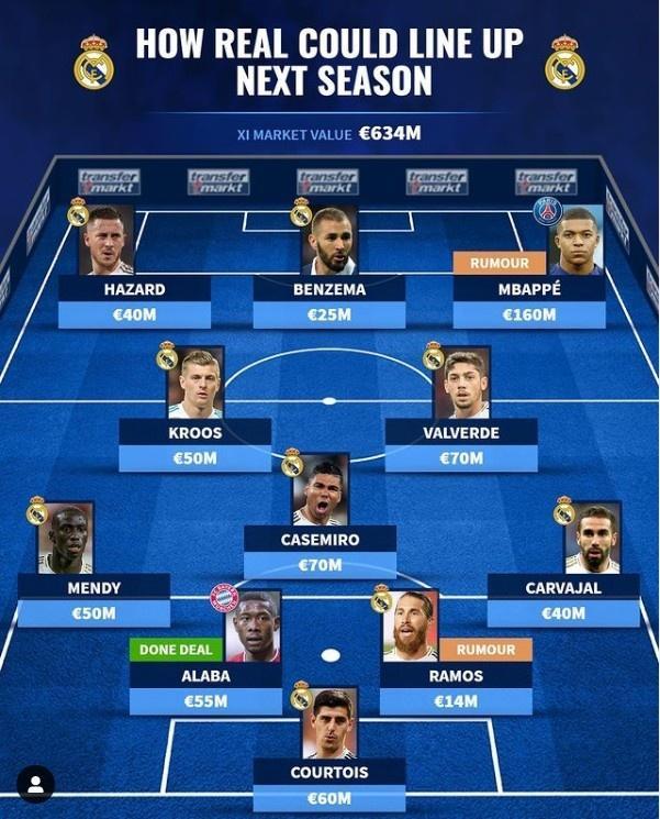 JRS直播网讯 皇马下赛季潜在首发(总身价6.34亿欧):