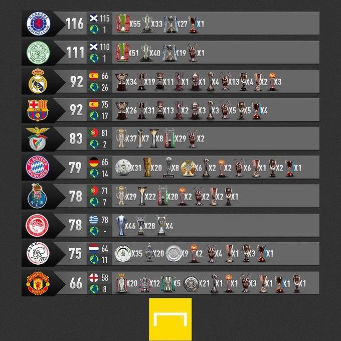 JRS直播网讯近日,进球网统计了到目前欧洲足坛俱乐部的冠军排行榜,苏超两大豪门流浪者和凯尔特人排名前二,皇马、巴萨均是92冠并列第三。
