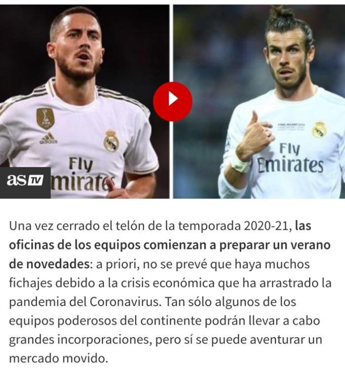 《阿斯报》认为,皇马将会是在今夏转会窗口最活跃的球队之一。30岁的阿扎尔和31岁的贝尔是皇马急于解决的两大难题,两人合计超过6000万欧元的年薪与他们在球场上的表现并不相符。