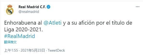 赛后,皇马官方:祝贺马竞夺得2020-2021西甲冠军。