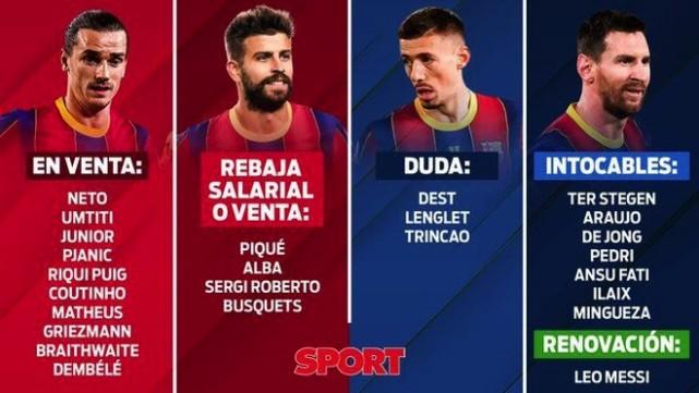 北京时间5月20日,加泰罗尼亚知名媒体《每日体育报》曝光了巴萨今夏的重建计划。这家巴萨“喉舌”将俱乐部的球员分为了三类。梅西领衔的8人将是“非卖品”,而皮克等4位元老功勋则处于“待定状态”,至于库蒂尼奥、格列兹曼等10人则已经进入了俱乐部的清洗名单。