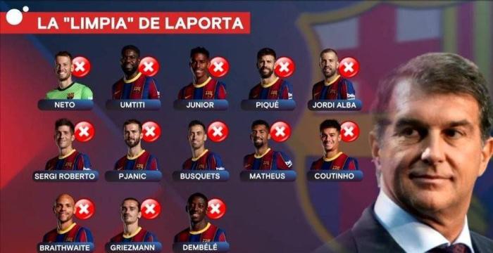 目前来看,拉波尔塔已经开始采取行动。在4台公布的名单当中,这13位将要被清洗的球员分别是皮克、格列兹曼、罗贝托、布斯克茨、阿尔巴、登贝莱、内托、菲尔波、皮亚尼奇、乌姆蒂蒂、库蒂尼奥和马特乌斯以及布莱斯维特。这13位球星在接下来将要面临被清洗的命运,当然了巴萨虽然想要都清洗掉这13人。但是最终能够成功达成目标的也就6~7名球员。