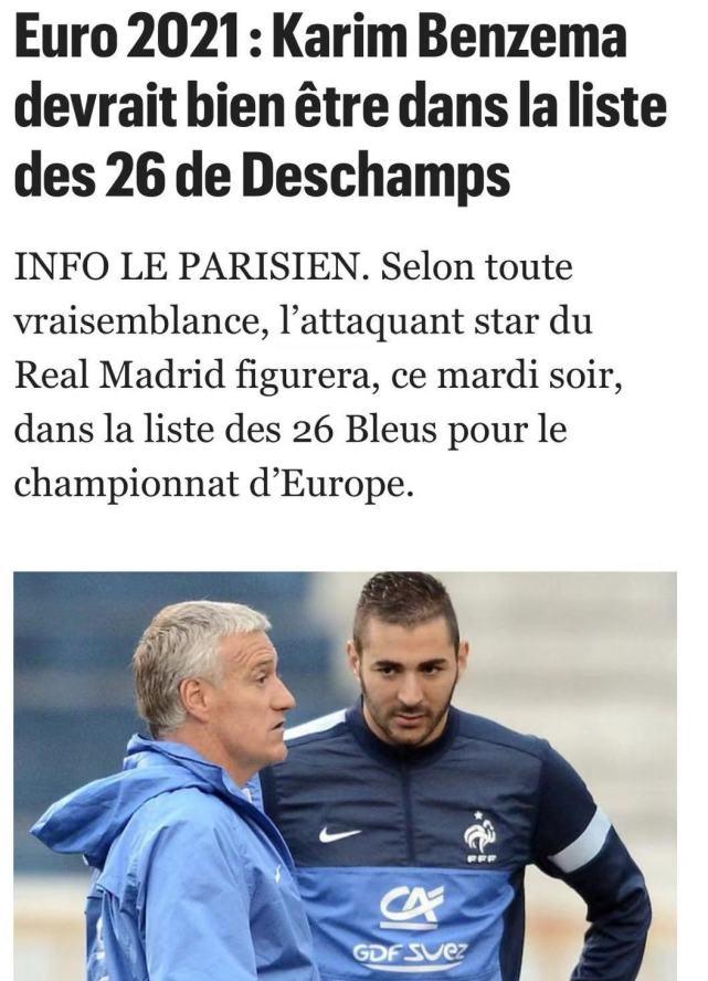 JRS直播网讯 此前,法国知名媒体《队报》曾发文称,关于本泽马回归国家队的话题,已不再是法国男足的禁忌,也许名单中会出现皇马前锋的身影。而北京时间5月18日晚,法国另外一家权威媒体《巴黎人报》也跟进了报道,本泽马确实“极有可能”会进入到德尚的法国男足国家队参加欧洲杯的26人大名单中。