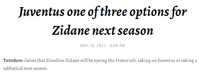 尤文图斯是齐达内的老东家,本赛季他们战绩不佳,虽然俱乐部称依然支持皮尔洛,但据称他已经失去更衣室。如果皮尔洛下课,接替他的有可能是齐达内。