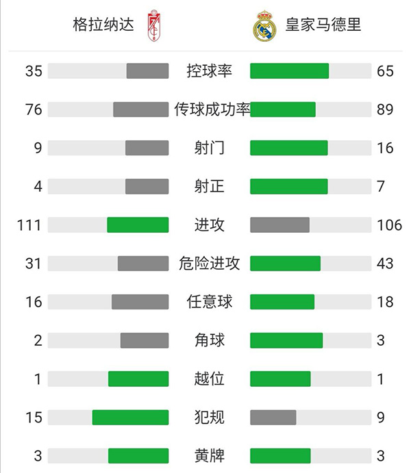 第17分钟,皇马取得领先,米格尔前场左侧外脚背挑传到禁区内,莫德里奇插上左脚小角度低射,皮球穿过鲁伊-席尔瓦裆下钻进球门,格拉纳达0-1皇马。