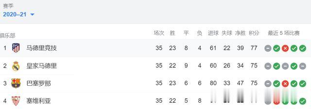 现在,西甲35轮已过,马竞77分排名第一,皇马和巴萨均75分,分列二三位。