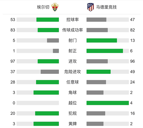 马德里竞技1-0埃尔切 M-略伦特制胜对手补时失点