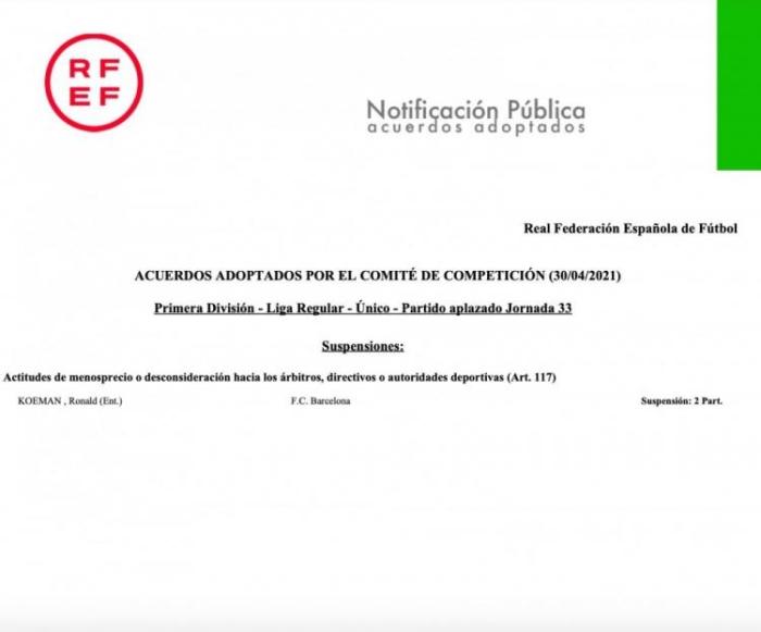 JRS直播网讯 今日,西班牙足协官方,巴萨主帅科曼被禁赛两场,错过对阵瓦伦和马竞。