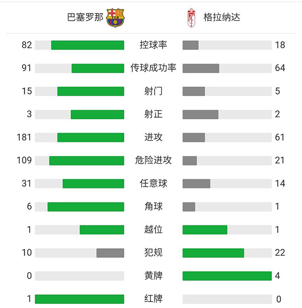 第23分钟,巴萨大禁区前沿左侧打成撞墙配合,梅西门前小禁区左侧接格列兹曼分球,左脚抽射远角破门,巴塞罗那1-0格拉纳达。