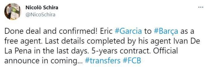 埃里克-加西亚出自拉玛西亚青训,他和曼城的合同在今年6月到期,此前他拒绝了瓜迪奥拉的挽留。