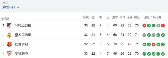 马竞输球后积73分排名第一,皇马和巴萨均积71分,排名第二和第三,塞维利亚则70分位居第四。