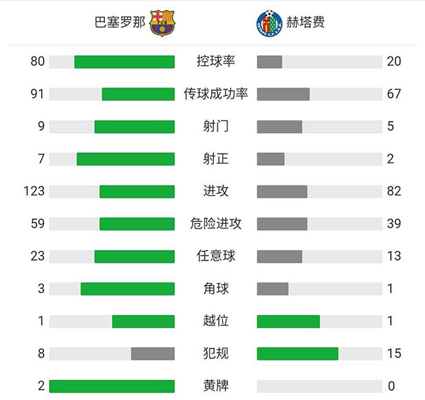 全场比赛结束,巴塞罗那5-2赫塔费。