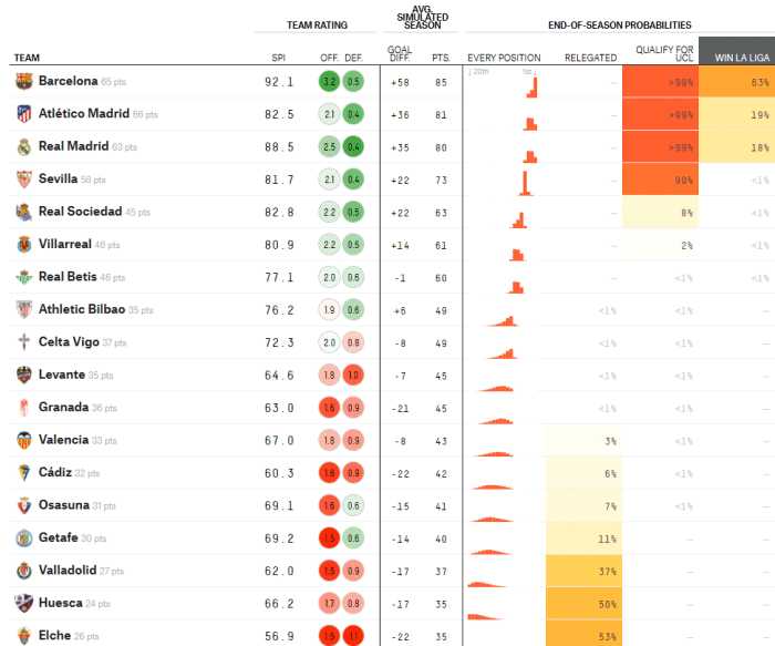 JRS直播网讯 西甲29轮过后,马竞在西甲积分榜上的领先优势已经变成了1分,这是所有人都没有想到的,此前马竞可以说是西甲夺冠最大的热门球队,他们曾经一度领先皇马、巴萨12分之多,但是现在马竞已经下滑了,他们虽然有积分优势,但是各大媒体已经不看好马竞夺冠了。近日,著名数据网站“538”更新了本赛季西甲夺冠几率,其中巴萨排名第一,而马竞仅排名第二,皇马位居第三。