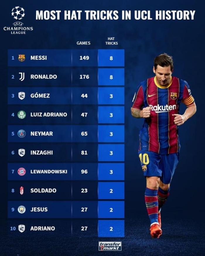 JRS直播网讯德国转会市场网日前盘点了欧冠帽子戏法次数最多的球员,梅西和C罗毫无争议地排名第一。