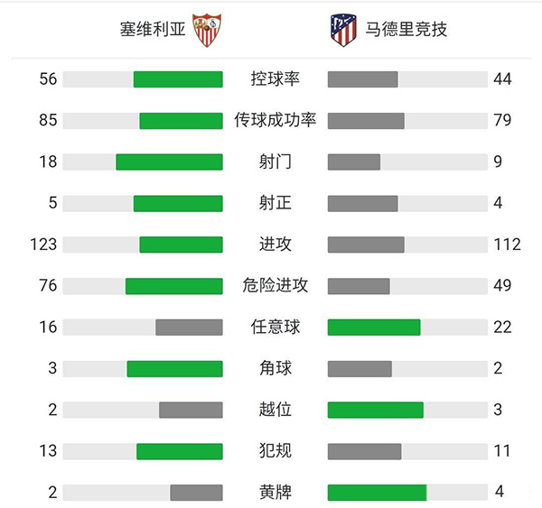 全场比赛结束,塞维利亚主场1-0力克马竞。