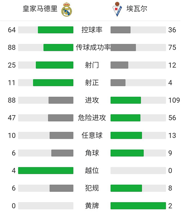 3分钟补时后全场比赛结束,最终皇马2-0击败埃瓦尔。