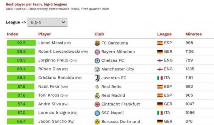 JRS直播网3月31日讯,CIES足球天文台为五大联赛球员在2021年前3个月的表现打分,梅西获得92.5分高居第一,他也是唯一一位90分以上的球员,身后是均获得89.5分的莱万和若日尼奥,C罗89.3分排在第五。
