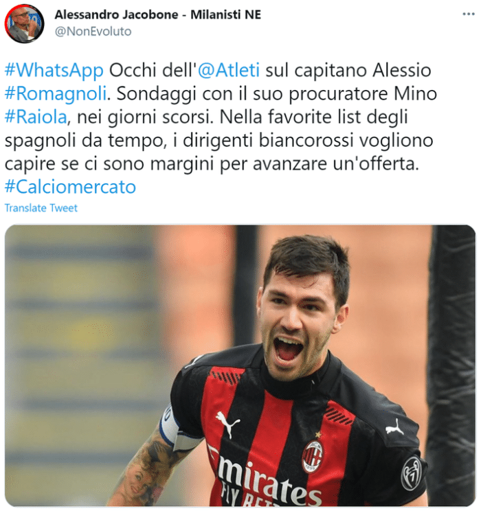 26岁的罗马尼奥利与米兰的合同将在2022年6月到期,这位记者称马竞正在关注他,并且近日已与其经纪人拉伊奥拉进行过接触。