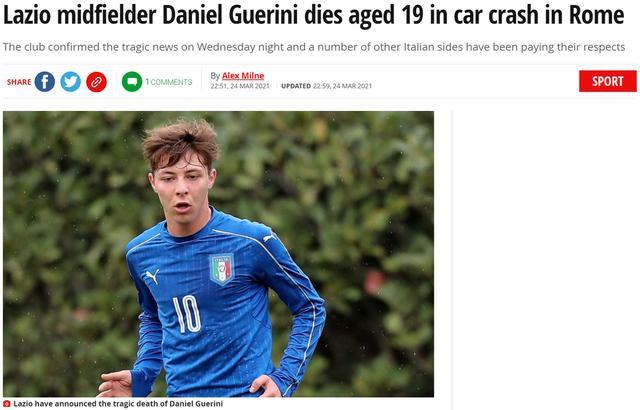 JRS直播网3月25日讯 据拉齐奥官方消息,球队小将丹尼尔-圭里尼离世,年仅19岁,根据媒体报道,这位小将因为遭遇车祸而不幸去世。