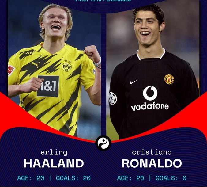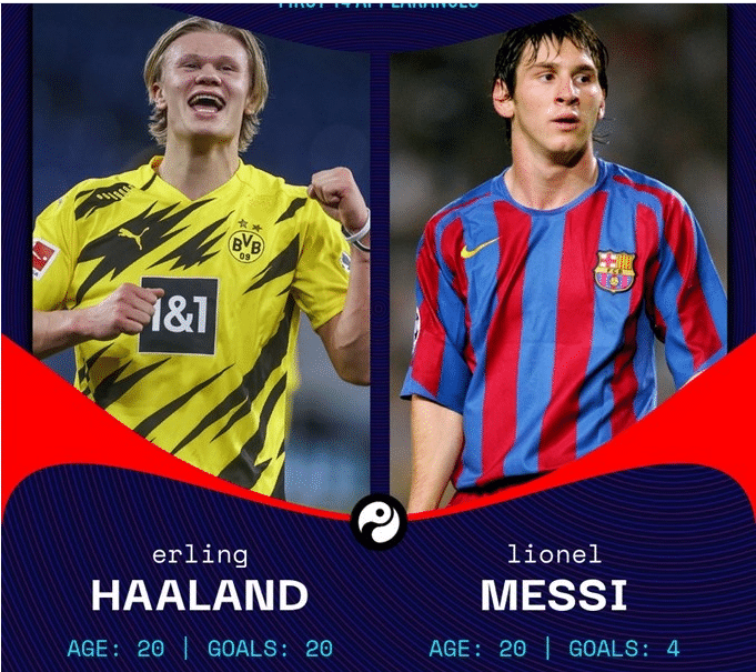 哈兰德20岁就完成了前14场欧冠比赛,他射门45次,射正29次,打进20球助攻2次,是所有球员中表现最好的一个。而C罗的表现就比哈兰德差很多,C罗虽然也是在20岁完成14场欧冠,但是他35次射门0进球1助攻的数据是所有球星中表现最差的那个。而梅西方面,他也是20岁完成了14场欧冠,而当时梅西也不过打进4球助攻1次,也远不如哈兰德的表现出色。