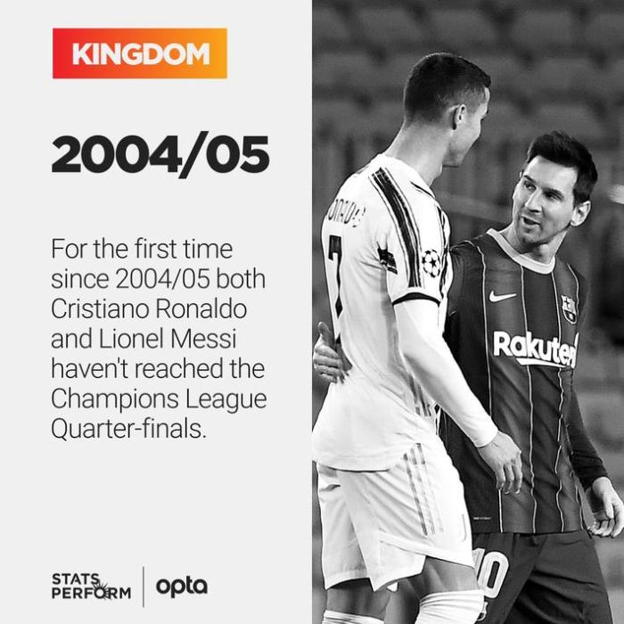 据OPTA数据统计,这是自2004-05赛季以来,梅罗两人第一次同时无缘参加欧冠八强。